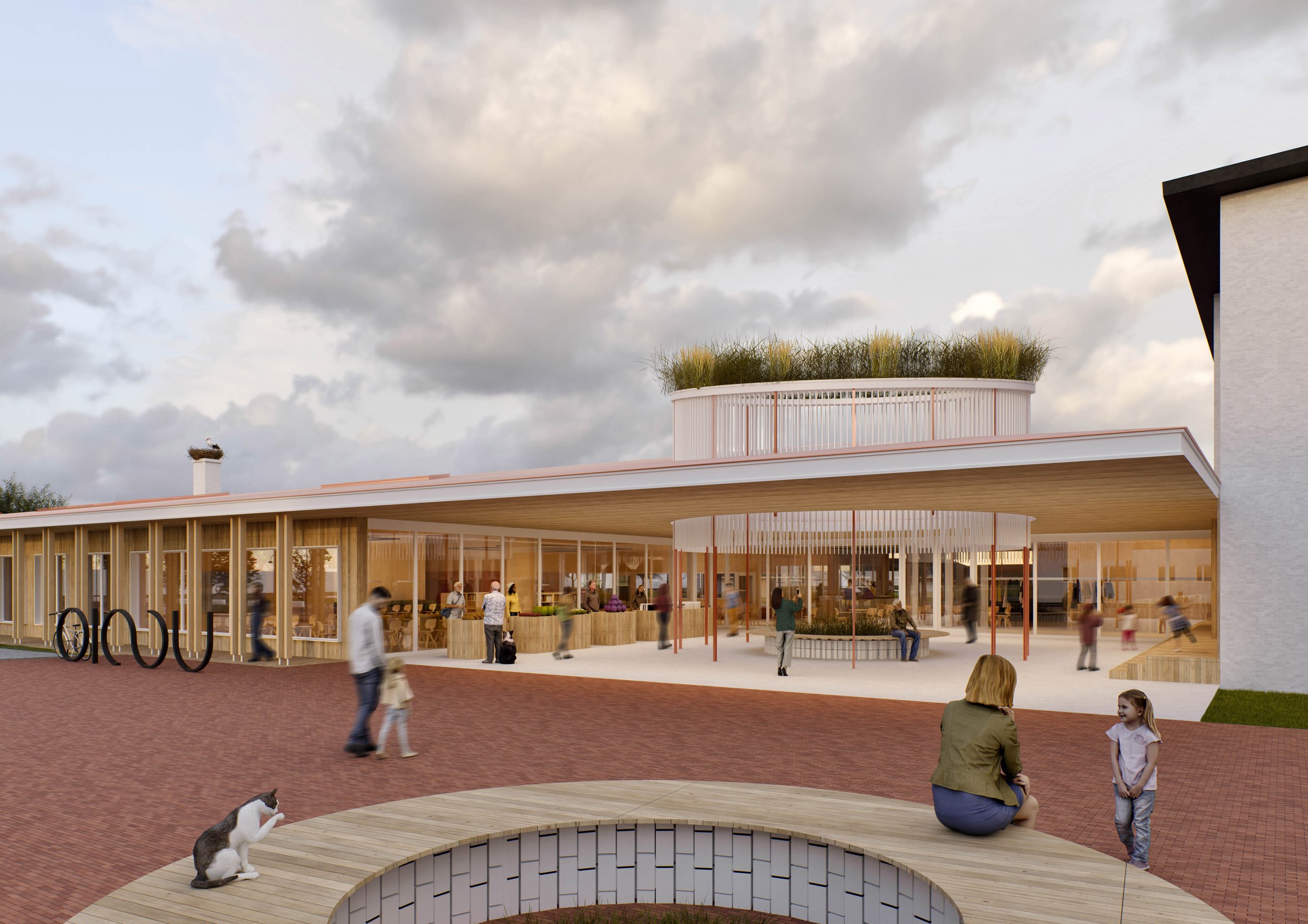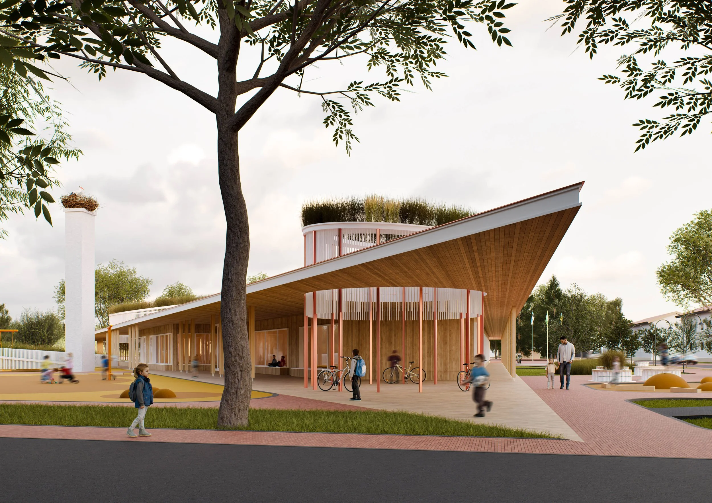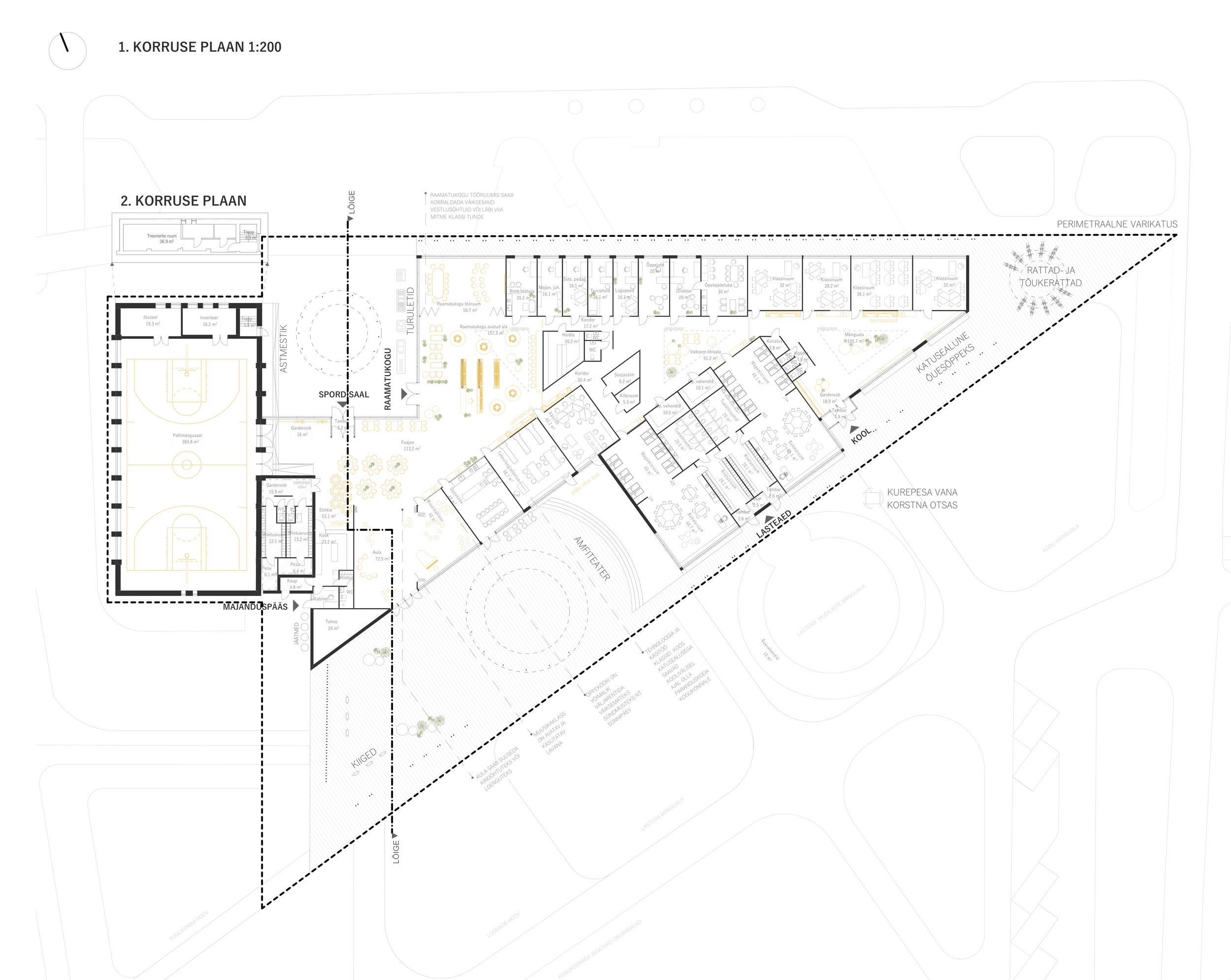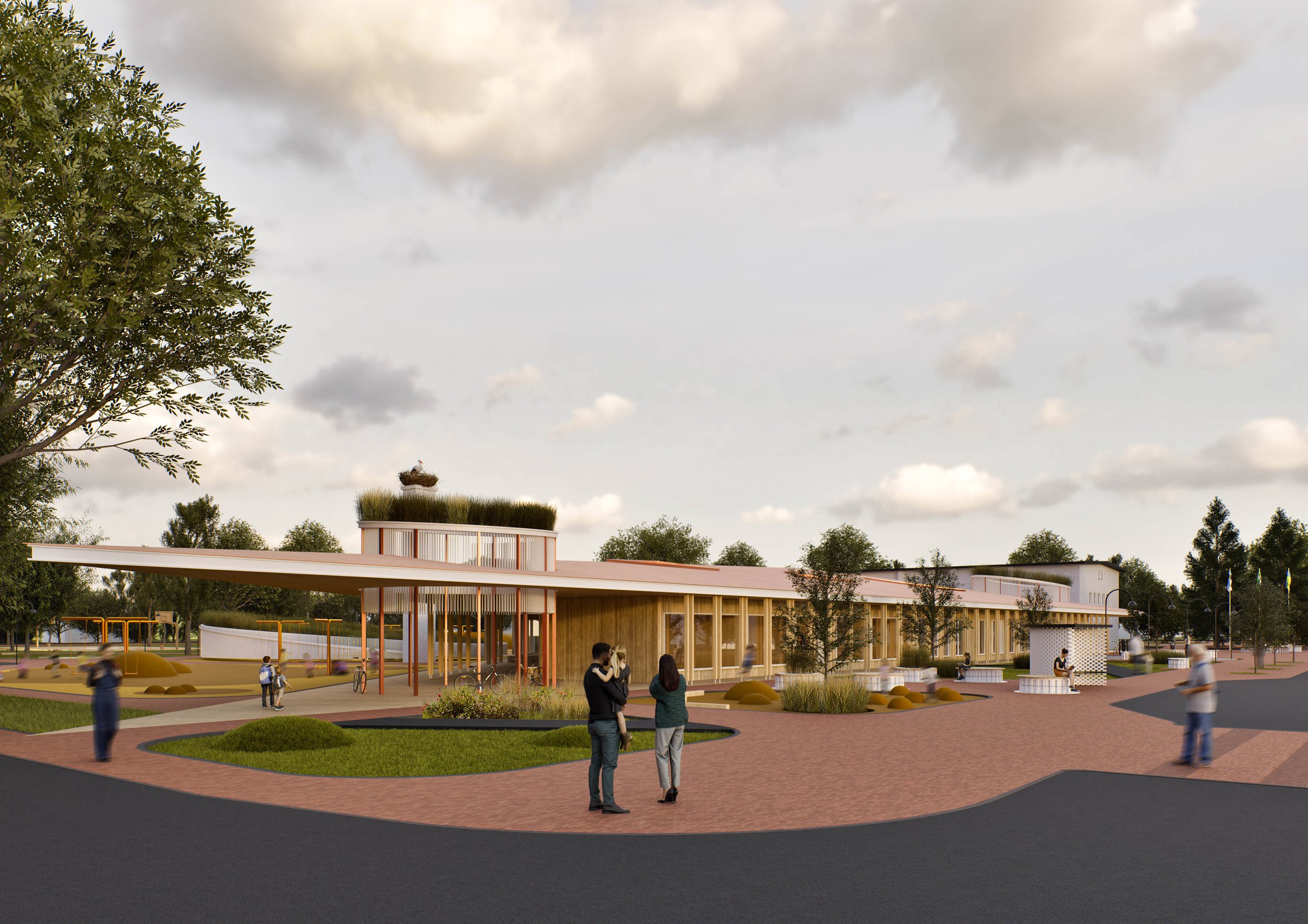 Olulisele kohale on seatud lasteaia kui ka kooliõpilaste mugav pääs päiksega õuealale, sest õuevahetunnis liigutakse kordades rohkem kui toas. Kogukonna ruumid on grupeeritud hoone keskmesse ning hakkavad tööle hoone südamena. Kogukonnale tekib tänavapoolne õhtuväljak, kus saab pidada laata ja muid väiksemaid üritusi. Hoovis on aga amfiteater ja kogukonnaaed.